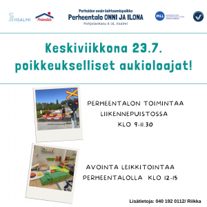 Tänään poikkeuksellisesti Perheentalon toiminta klo 9-11.30 Lasten liikennepuistossa ja sen jälkeen avointa leikkitoimintaa klo 12-15 Perheentalolla sisällä . Näin voidaan päivän kuumin aika viettää viileässä. Tervetuloa leikkimään!