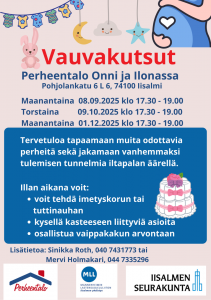 Tervetuloa seuraaville Vauvakutsulle maanantaina 8.9.2025 klo 17.30 - 19.00 Perheentalo Onni ja Ilonaan, Pohjolankatu 6 L 6. Iltaan ei tarvitse ilmoittautua. Vauvakutsuille voit tulla missä tahansa vaiheessa raskautta. Tervetuloa Vauvakutsuille joko yksin tai puolison/kumppanin tai ystävän kanssa. Tarjolla iltapalaa!