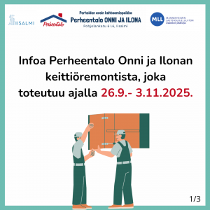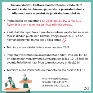 Perheentalo on suljettuna pe 26.9., pe 31.10. ja ma 3.11. Ryhmät ja avoin toiminta niiltä päiviltä peruttu.