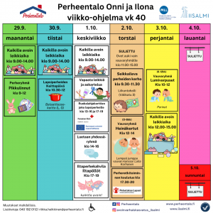 Perheryhmä Pikkulinnut klo 9-12. Perheryhmään ovat tervetulleita kaikki alle kouluikäisten lasten perheet. Vapaata yhdessäoloa ja leikkiä. Ohjattua toimintaa perheiden toiveiden mukaan. Yhteistyössä Iisalmen seurakunnan kanssa.