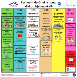 Perheryhmä Pikkulinnut klo 9-12. Perheryhmään ovat tervetulleita kaikki alle kouluikäisten lasten perheet. Vapaata yhdessäoloa ja leikkiä. Ohjattua toimintaa perheiden toiveiden mukaan. Yhteistyössä Iisalmen seurakunnan kanssa.