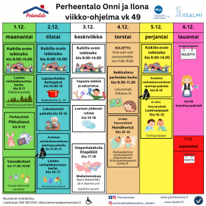 Seikkaileva perheiden kerho seikkailee Liikuntahallilla (Välikatu 3) klo 9.30–11.30. Liikunnallisia leikkejä ja pelejä. Välipalaa tarjolla.