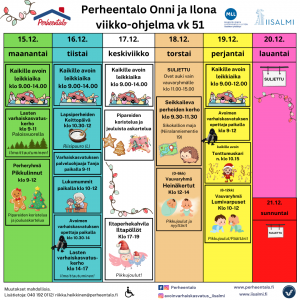 Perheryhmä Pikkulinnut klo 9-12. Perheryhmään ovat tervetulleita kaikki alle kouluikäisten lasten perheet. Vapaata yhdessäoloa ja leikkiä. Ohjattua toimintaa perheiden toiveiden mukaan. Yhteistyössä Iisalmen seurakunnan kanssa. Jouluaskartelua ja pipareiden koristelua.