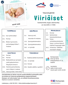 Vauvaryhmä Viiräiset, n. 0-6kk vauvoille ja heidän vanhemmilleen. Voit tulla mukaan jo odotusaikana! Täällä saat vertaistukea vauvan ensimmäisille kuukausille.