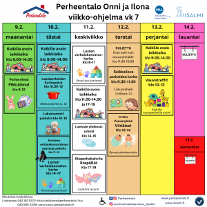 Seikkaileva perheiden kerho seikkailee Liikuntahallin alakerrassa (Välikatu 3.) klo 9.30–11.30. Yhteisiä leikkejä ja Perhetupa Väkkärän uniohjaaja paikalla. Kaikille avoin ja maksuton, ei ilmoittautumista. Välipalaa tarjolla. Lisätietoa Anna-Kaisalta.