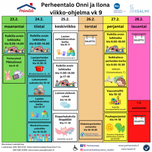 Perheentalon Puuhaperjantai klo 14–18. Perheiden toiveesta olemme lisänneet aukioloaikaa muutamaan iltapäivään. Tervetuloa mukaan! Näistä perjantaista on mukava ponkaista viikonlopun viettoon.
