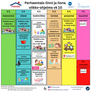 Seikkaileva perheiden kerho seikkailee Iisalmen liikuntahallilla (Välikatu 3.) klo 9.00–10.30. Liikuntaa ja leikkejä koko perheelle. Kaikille avoin ja maksuton, ei ilmoittautumista. Välipalaa tarjolla. Lisätietoa Anna-Kaisalta.