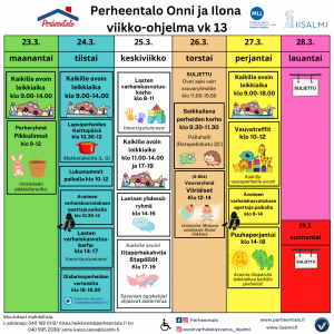 Perheentalon Puuhaperjantai klo 14–18. Perheiden toiveesta olemme lisänneet aukioloaikaa muutamaan iltapäivään. Tervetuloa mukaan! Näistä perjantaista on mukava ponkaista viikonlopun viettoon.