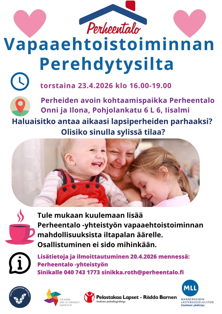 MLL:n Iisalmen yhdistys ry:n avoimessa kohtaamispaikassa Perheentalo Onni ja Ilonan perhekahvilassa vapaaehtoisen tehtävänä on toivottaa tulijat tervetulleiksi ja kohdata perheitä ja lapsia yhdessä työntekijöiden kanssa. Perhekahvilassa halutessaan myös leipoa, leikkiä, lukea tai tarjota ylimääräisen sylin.